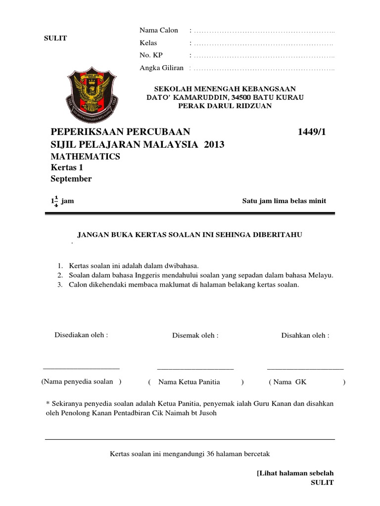 Contoh Format Muka Depan Soalan Kertas 1 Peperiksaan Percubaan Spm 2013 Sedaka Matematik Pdf